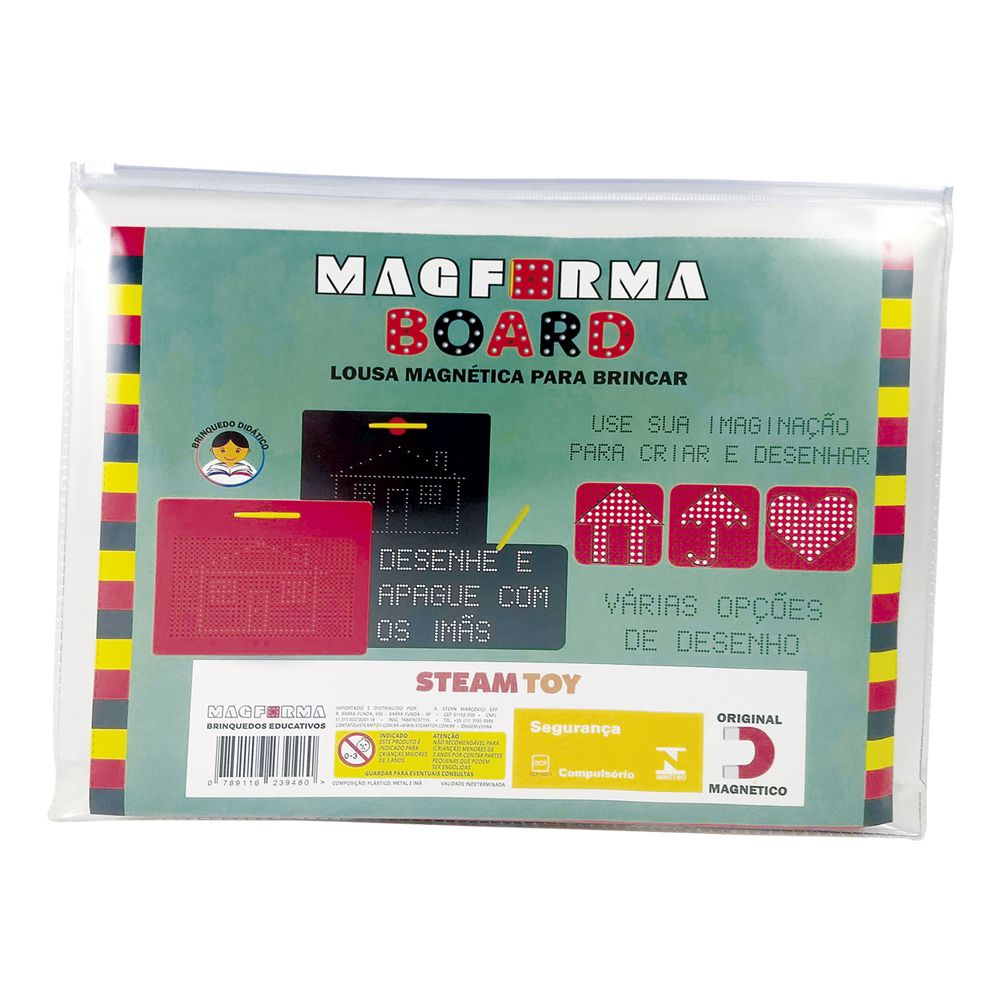 A lousa magnética na cor preta e vermelha tem 714 pontos com pequenas esferas magnéticas, possibilitando que a criança crie seus desenhos e palavras conforme sua imaginação. Para usá-la, basta passar a caneta magnética sobre os pequenos furos e as esferas ficarão na parte superior. Para desfazer, é preciso passar a mão, empurrando as esferas de volta.